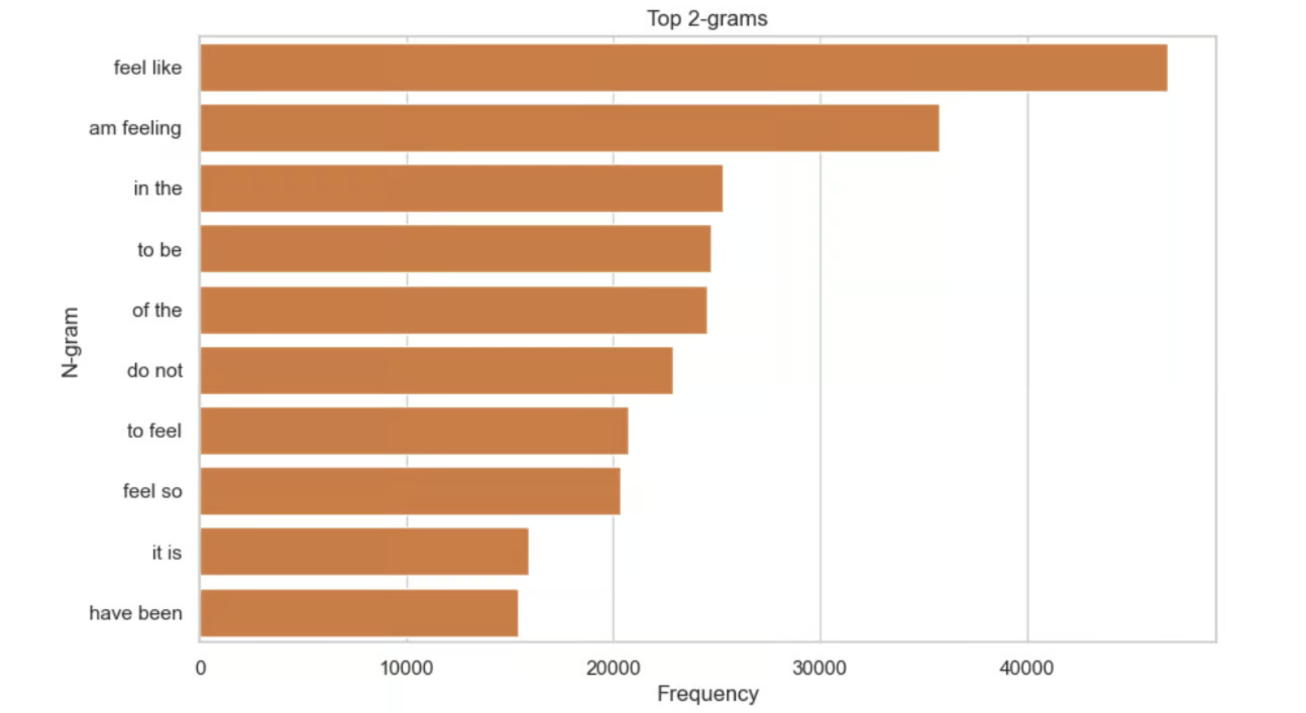 N-gram analysis (bigrams) captured syntactic/semantic cues. “feel like” was most frequent (46,816), with common collocations like “in the,” “to be,” and “of the,” informing contextual emotion cues.